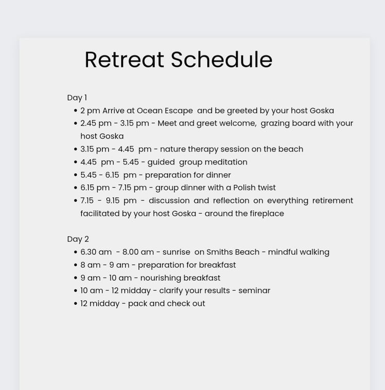 3-day itinerary for a Winter Ocean Escape Retreat 21-23/06/2023